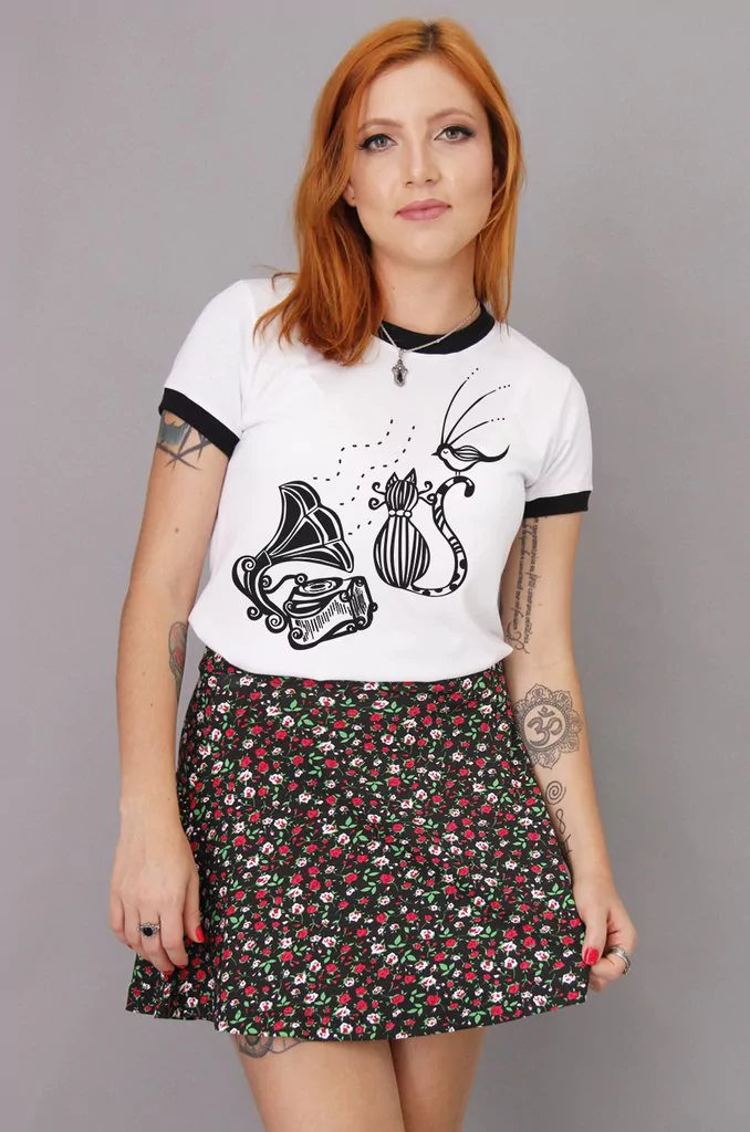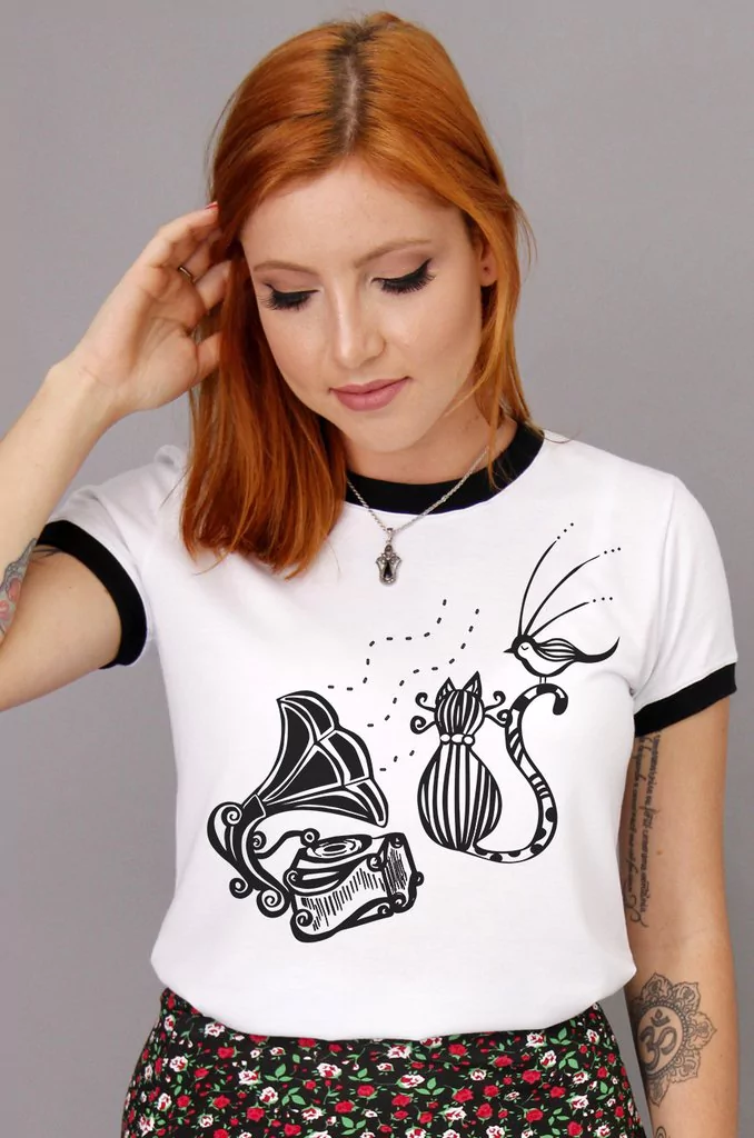 Camiseta feminina ringer tee com modelagem ajustada, produzida nas cores branco+preto.
