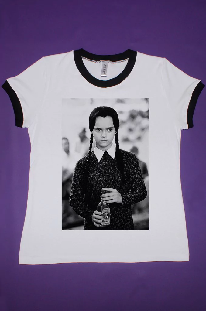 Camiseta feminina ringer tee com modelagem ajustada, produzida nas cores branco+vermelho escuro.